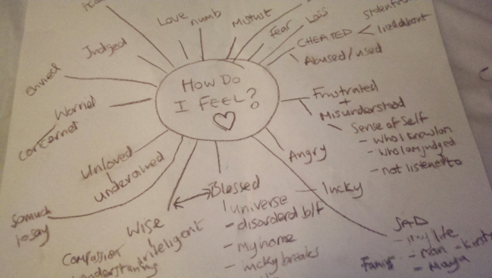 When I do mind mapping and brain storming, I use a large piece of paper, in the centre draw a circle…… this circle represents the centre of you. The core of you. From this draw branches off that say how you feel.  No matter how random. Link those thoughts together. Put them into groups. Sometimes you will feel opposing thoughts. It doesn’t matter. This is you, for you. It is a useful tool when you are feeling, lost, disorientated, confused, in pain, and struggling to cope with racing feelings, and conflicting emotions.